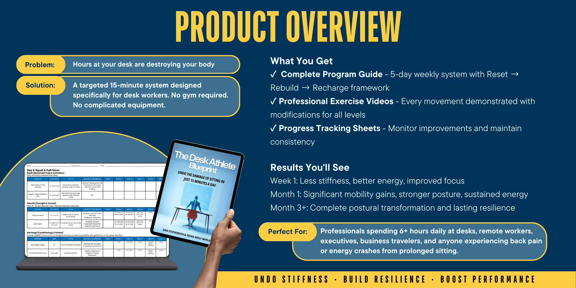 The Desk Athlete Blueprint is a targeted movement system designed specifically for working professionals who want to undo the damage of desk work without spending hours in the gym or disrupting their demanding schedule.